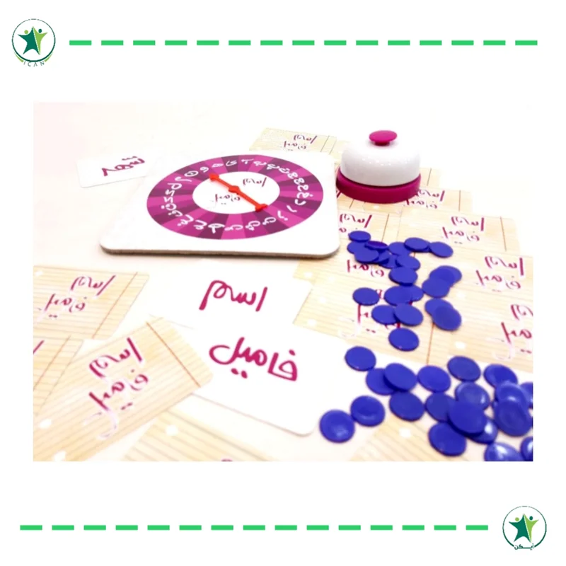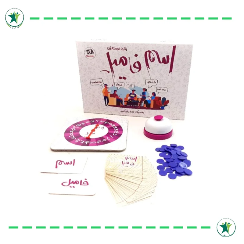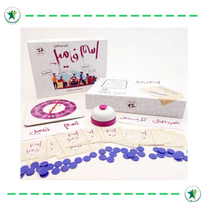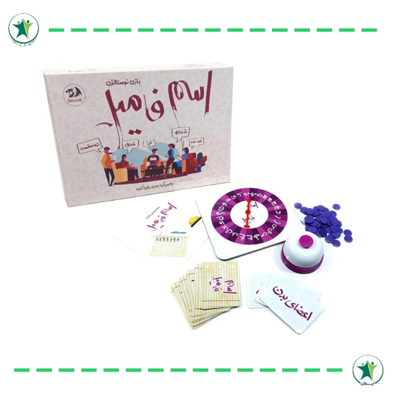 بازی اسم فامیل دراگون زنگی یک بازی 2 تا 12 نفره خانوادگی برای گروه سنی 8 سال به بالاستداخل بسته این بازی 20 کارت عنوان / 50 عدد سکه امتیاز / 1 عدد صفحه بازی ( روی این صفحه همه حروف الفبا فارسی به صورت دایره ای کشیده شده که وسط این دایره یک عقربه نشان می باشد ) / 1 عدد زنگ قرار داردواسه شروع بازی همه کارت های عناوین رو بر می زنید وسط بازی قرار بدین . صفحه بازی رو کنار دسته کارت ها و زنگ بازی رو هم کنارشون می ذاریم.توی هر دور بازی اول یک کارت عنوان رو می کنید و بعد گردونه روی صفحه بازی رو می چرخونیم. عقربه نشان روی هر حرفی ایستاد بازیکنان باید سعی کنن با اون حرف جواب کارت عنوان رو پیدا کنن . اولین بازیکنی که زنگ رو به صدا در بیاره باید جواب رو اعلام کنه . در صورت درست بودن جواب یک سکه از سکه های امتیاز واسه خودش بر می داره و در صورت اشتباه بود و یا فراموش کردن جواب بعد زنگ زدن ، باید اگه سکه تو دستش داشته باشه یک سکه به عنوان جریمه به بانک بپردازه.وقتی همه سکه های بازی داخل بانک تموم شد بازیکنی که بیشترین سکه رو داشته باشه برنده بازی میشه.