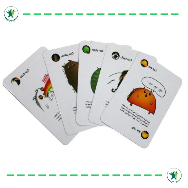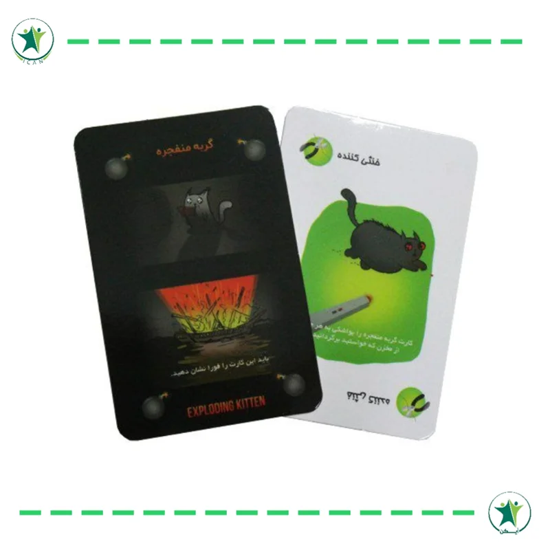 بازی گربه های انفجاری دراگون 1یک بازی کارتی ساده رواناین بازی رو میشه 2 تا 10 نفره بازی کرد خوبیه این بازی اینه که تقریبا همه اعضای خانواده می تونن بازی کنن. هدف از بازی گربه های انفجاری دراگون این است که منفجر نشویم. در بازی گربه های انفجاری دراگون یکسری کارت هستند به اسم گربه های انفجاری که اگر این کارت برای ما بیاید باید با کارت خنثی کننده آن را خنثی کنیم ولی اگر کارت خنثی کننده نداشته باشیم ما منفجر می شویم و بازی را می بازیم.در ابتدای بازی باید همه ی کارت های گربه های انفجاری و خنثی کننده ها را جمع کرد و کنار گذاشت و بعد از آن از کارت های باقی مانده بعد از قاطی کردن آنها به هر بازیکن 4 عدد کارت می دهیم و بعد ، از کارت های خنثی کننده بیرون به هر بازیکن یک عدد میدهیم پس در نهایت به هر بازیکن 5 عدد کارت میرسد.بعد از مراحل بالا به تعداد یکی کمتر از تعداد بازیکنان ما کارت های گربه انفجاری را درون کارت های وسط بازی می گذاریم و باقی کارت های خنثی کننده را هم درون کارت های وسط بازی قرار می دهیم. و بعد همه ی کارت های وسط بازی را قاطی می کنیم که خوب هم زده شوند.بازی به صورت نوبتی میباشد و نوبت به هر بازیکن که می رسد آن شخص یا باید یک کارت از کارت های باقی مانده وسط بازی را بردارد یا اینکه از کارت هایی که در دستش وجود دارد یک یا چند بار آنها را بازی کند و بعد از آن حتما باید یک کارت را بردارد نفر شروع کننده بازی به دلخواه انتخاب می شود.کارت های بازی گربه های انفجاری دراگونکارت حمله : این کارت باعث می شود که نفر بعدی 2 دور بازی کند.کارت همزن : این کارت باعث می شود که شما کارتهای مخزن را بر بزنید.کارت عشقی : یکی از بازیکنان را انتخاب کنید تا بهانتخاب خودش یک کارت از دستش به شما بدهد.کارت هایی که اسم گربه دارند: این کارت ها 5 تا هستند و باید توجه کنید که بازی کردن هر کدام هیچ تاثیری ندارد ولی اگر دو تا از هرکدام از این نوع ها داشته باشید و بازی کنید.می توانید از نفر بعد بدون اینکه کارت هایش را ببینید یک کارت به صورت دلخواه بردارید. این کارت ها شامل کارت های گربه وانه، گربه لاری، گربه ویچ ، گربه پشندی و گربه پیشی کمون.کارت پرش : هرکس که کارت پرش را بازی کند از نوبت خود رد می شود و نوبت بازیکن بعدی می شود. و دیگر نیاز به برداشتن کارت نیست.کارت کف بینی : اگر این کارت را بازی کنید می توانید بدون اینکه دیگران ببینند 3 تا از کارت های اول بازی روی میز را ببینید از آنها با خبر شوید.کارت نه: کارت نه را می توان روی هر کارتی بازی کرد و عملکرد آن کارت را خنثی کرد. این کارت را روی همه ی کارت ها به جز کارت گربه های منفجره و خنثی کننده می توان بازی کرد.کارت برعکس : نوبتتان بدون برداشتن کارت تمام می شود بازی به سمت بازیکن قبلی برمی گرددکارت خنثی کننده و گربه منفجره : باید کارت را به بقیه نشان دهید و از بازی خارج شوید. اگر کارت خنثی کننده دارید آن را می سوزانید و در بازی می مانید.هر بازیکن می تواند هر تعداد کارت که بخواهد و در دستش هست بازی کند. ولی بعد از آن حتما باید یک کارت را ار وسط بردارد.این پروسه تا زمانی که یک نفر فقط در بازی بماند ادامه پیدا میکند و نفر آخر برنده بازی می باشد.